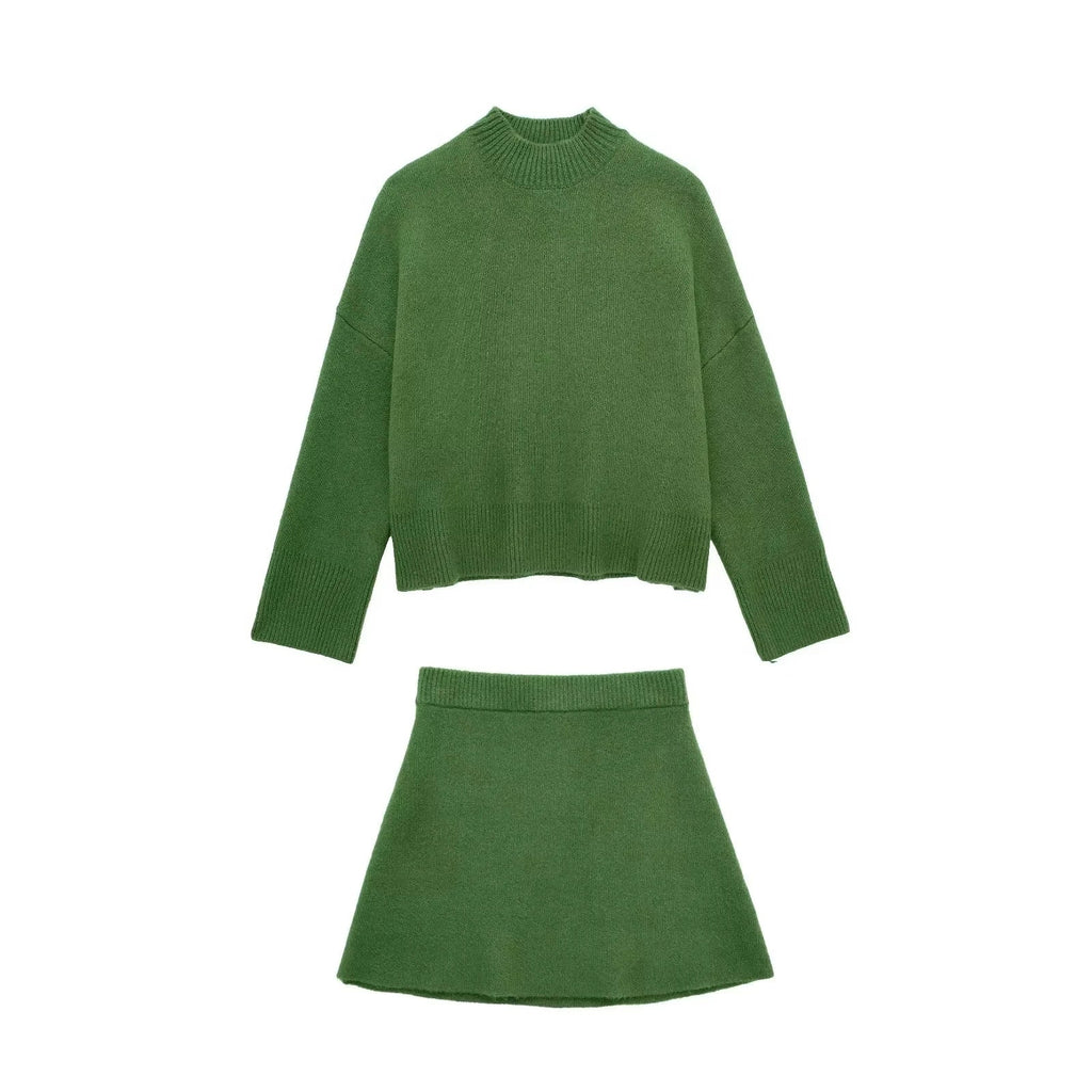 Descubra o charme e a sofisticação do Conjunto Verde Outono/Inverno, composto por um suéter de manga longa com decote redondo e uma minissaia estilo linha A. Perfeito para os dias mais frescos da estação, este conjunto monocromático combina praticidade, elegância e conforto em uma única peça.